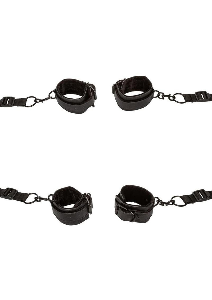 4 totally adjustable and detachable wrist or ankle cuffs with VelcroB. style closures. 4 sturdy, adjustable tethers to fit most mattresses. May be used under any bed or as individual tethers. Universal clasps and O-rings with swivel design for full dexterity. Soft and plushy interior with a vegan leather exterior. Double padded, double stitched. Functional, durable and textured design.