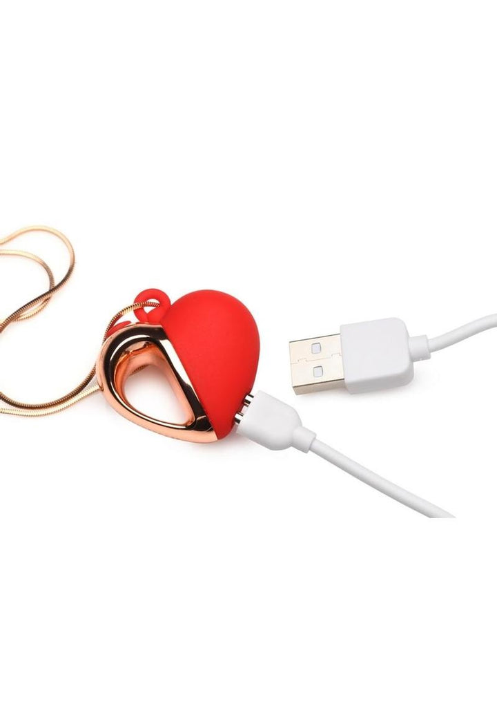 Adorn yourself with a heart that loves you back. This vibrating, silicone, heart necklace has firm, smooth silicone that is brilliant red with a contrasting, rose gold half you can use to hold onto like a handle. The artistically designed heart is fashionable so you can wear it discreetly without anyone knowing its alternative purpose. This small heart packs a powerful, buzzing punch of 3 speeds and 7 patterns that tingle and tease your sensitive, erogenous zones down below. Pleasure never looked so beautiful! As a bonus, this compeltely rechargeable vibe can also be taken in the shower, too! It's rated as IPX6 waterproof so it can handle powerful jet streams. Phthalate-free and nickel-free, it's body-safe to use with water-based lubricants. Do not submerge under water. Wash with warm water and mild soap after each use to keep it clean, then spray with a toy cleaner and pat dry. Recharge using the USB cable provided.