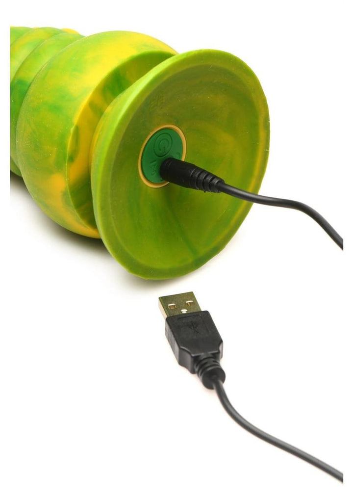 Enjoy your favorite Creature Cocks dildo with this vibrating Monstropus Tentacle! This yellow and green tentacle is massive and thick. The tapered tip helps with insertion, but from there on you can enjoy deep stretching as you fill yourself up with this firm yet squishy rod! Covered in suckers, this uniquely textured shaft stimulates you in new and spectacular ways! To add to the sensations, there's a powerful vibrator inside of the toy that packs 3 speeds and 7 patterns of vibration! Take this monster tentacle inside of you while enjoying the deep, powerful, rumbling vibrations! This toy is perfect for solo play and has a strong, suction-cup base for hands-free riding! Combine it with a compatible strap-on harness and enjoy some serious pegging fun! Indulge in any kinky cosplay, fantasy roleplay, or deviant desire, and rest easy knowing this rod is made out of premium, phthalate-free, body-safe silicone! Rated IPX6, it can be taken in the shower but cannot be submerged underwater. To recharge, use the USB cable provided. After play, wash with warm water and mild soap, then rinse and spray with a toy cleaner before patting dry. Use only with water-based lubricants for best results.