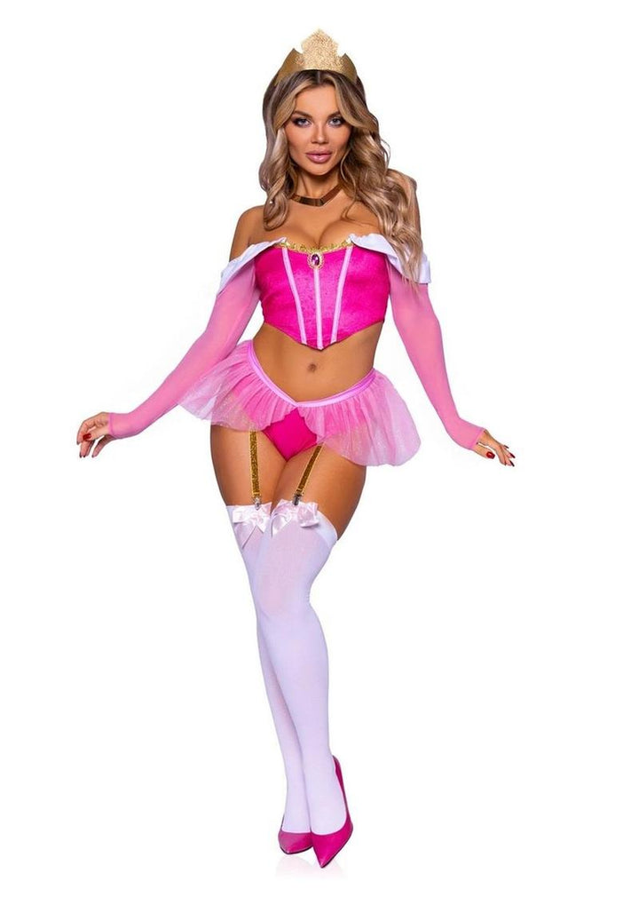 4 Pc Dreamy Princess, Includes Velvet Boned Crop Top With Jewel Accent, Garter Panty With Peplum Skirt, Removable Clear Straps, And Crown Headband. XS PINK
