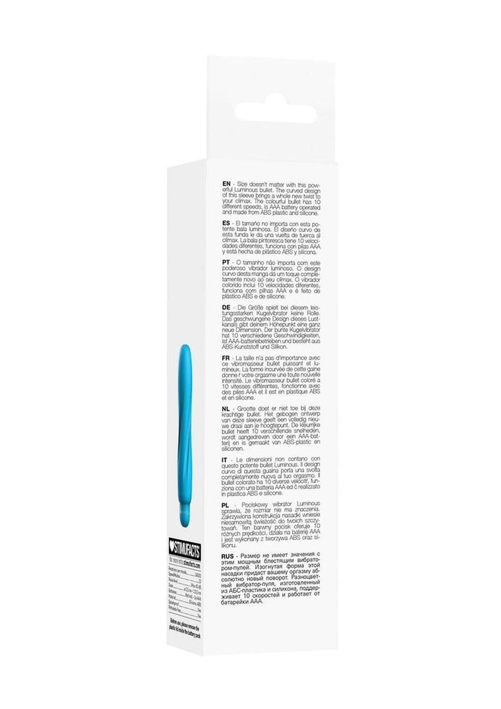 Size doesnb t matter with this powerful Luminous bullet. The design of this sleeve can definitely pinpoint the right spot! The colourful bullet has 10 different speeds, is AAA battery operated and made from ABS plastic and silicone.