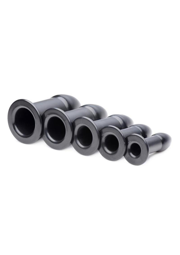 Go from backdoor beginner to advanced anal enthusiast with this set of 5 hollow, graduated sized anal dilators. Each tapered plug is shaped to be comfortably inserted, with a pointed end and flared base that will help keep everything in place for extended wear. The hard, smooth ABS plastic provides the firmness needed for easy insertion and is compatible with all types of lubricants. Use the plugs alone for pleasure, or use them as a tool to gradually step up your tolerance so you can take larger and larger toys. The graduated size allows you to work up to your desired size in ecstasy and ease.