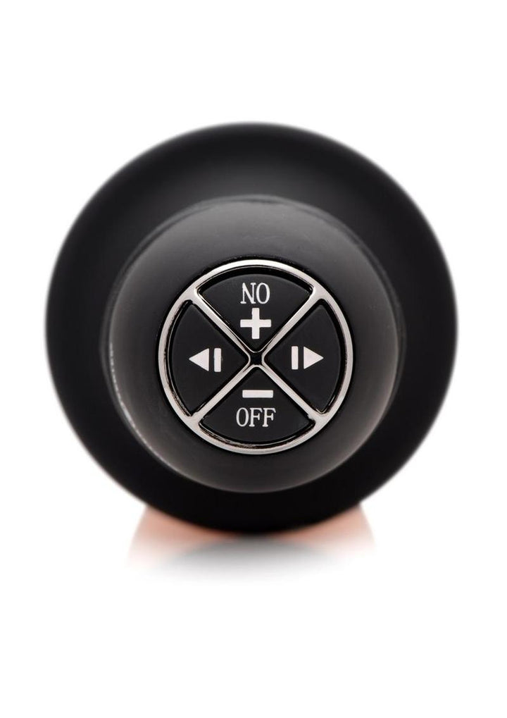 This huge, hilted man-meat is ultra realistic, with bulging veins and a bulbous head! This unforgettable thruster will massage you on the inside with every ram of that enormous shaft. How much do you think you can handle? With an outstanding 9.75 inches of textured length, 3 intense vibration speeds, and 10 unique patterns of pulsation, you have plenty to work with! Take hold of the grooved, easy-to-grip handle and aim for your favorite hole. Use on your own or with a partner for an intense penetrative experience! Compatible with both silicone and water-based lubricants.