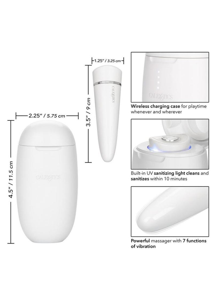 The MyPodb" is redefining pleasure with technology, convenience and mobility at its core. This start-of-the-art massager provides an unparalleled pleasure experience whenever and wherever you desire. With a unique charging case, built in UV sanitizing light and powerful vibrations, the MyPodb" bullet is the future of travel-ready pleasure.No more messy cords or cables, this massager is the first of its kind with a wireless charging case with magnetic connection. Simply drop the massager into the case to recharge a fully drained bullet up to 2 times. With 7 functions of powerful vibration, pulsation and escalation, this sleek massager will transport you to a paradise of pleasure.Stop the guesswork about how much battery is left, a battery indicator light lets you know when the massager is ready for playtime. Travel-ready pleasure should mean no fuss cleaning, so one-of-a-kind built-in UV sanitizing light cleans and sanitizes the bullet within 10 minutes inside of the charging case. The slim bullet runs for 40 minutes on high speed, 50 minutes on low speed, and can completely recharge massager and case in just 2 hours.