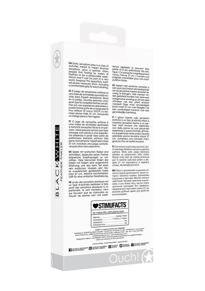 Erotic sensations play is a class of activities meant to impart physical sensations upon a partner. Many people find tickling by means of feathers to be a pleasurable experience and it can be part of a very erotic foreplay! The new OUCH! Feather is in a class of it's own and will tickle all your senses for an unforgettable experience! This beautifully crafted plume measures 27cm, including a comfortable grip for easy handling.
