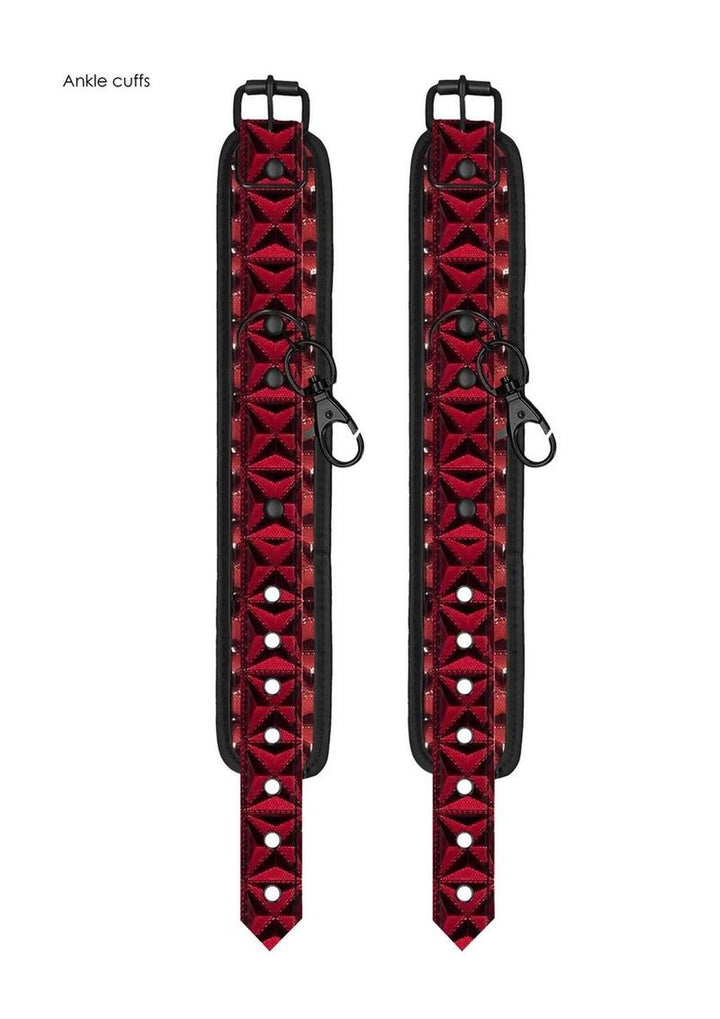 Getting on all fours" will have an exciting new meaning in your sex life! The OUCH! hogtie fulfills all your kinky dreams, and more! In any BDSM collection, a hogtie plays an important role and with this high-quality equipment you can have a go at it yourself. With their fashionable diamond pattern, these neoprene and faux-leather cuffs and cross really stand out from the crowd! The hogtie consists of 2 ankle cuffs, 2 handcuffs, and a cross" with four O-rings. The ankle cuffs are 39 cm (15.4") long and 5.5 cm (2.2") wide with 7 holes for size adjustment. The handcuffs are 36 cm (14.2") long and 5 cm (1.97") with 6 holes for size adjustment. The hogtie cross" has 4 lengths of 27.2 cm (10.7") each.