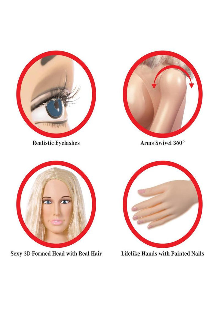 This incredible life-size inflatable love doll was meticulously designed with realistic features for a truly lifelike experience. Her sexy 3-D formed head features realistic eyelashes and a luxurious head of real hair that's begging to be pulled! Watch her really come to life with arms that swivel 360 degrees and delightfully painted finger and toenails. Give her firm and perky breasts a squeeze while you enjoy her ultra-lifelike Fanta-Flesh skin, pussy, and ass that feels even better than the real thing! The Fanta-Flesh pussy and ass are removable for easy in-depth cleaning, and can even be enjoyed separately for masturbation. An inflation pump, vinyl repair kit, and instructions are conveniently included.