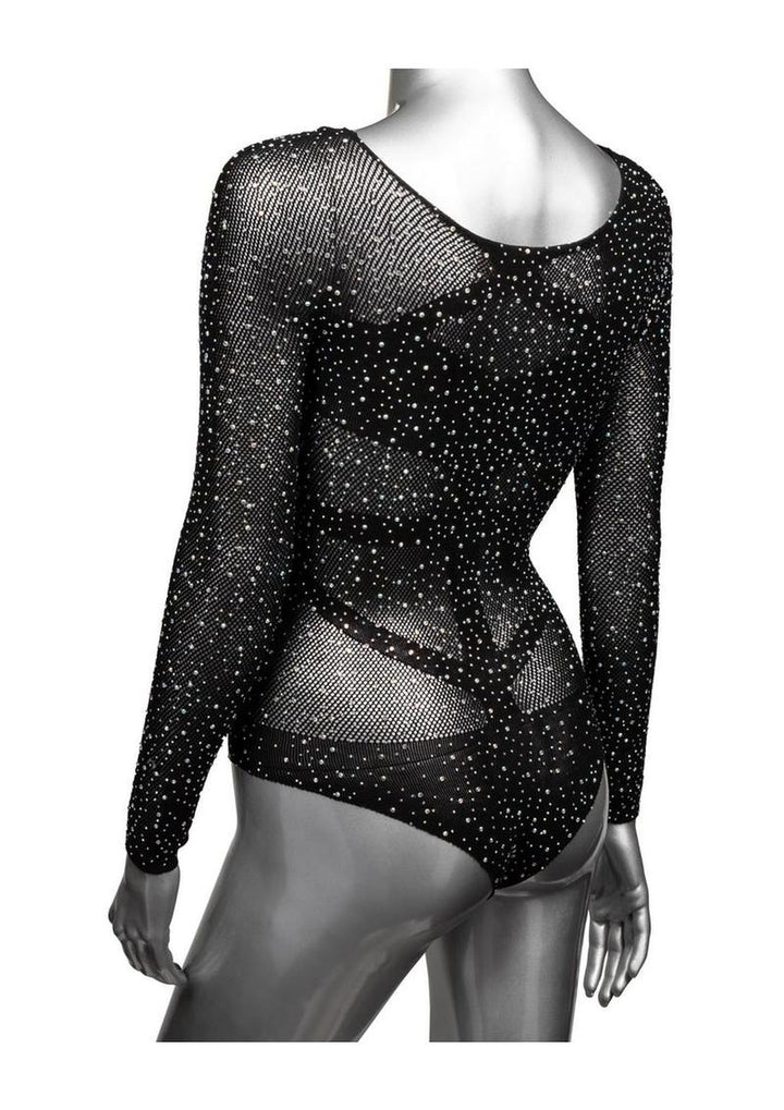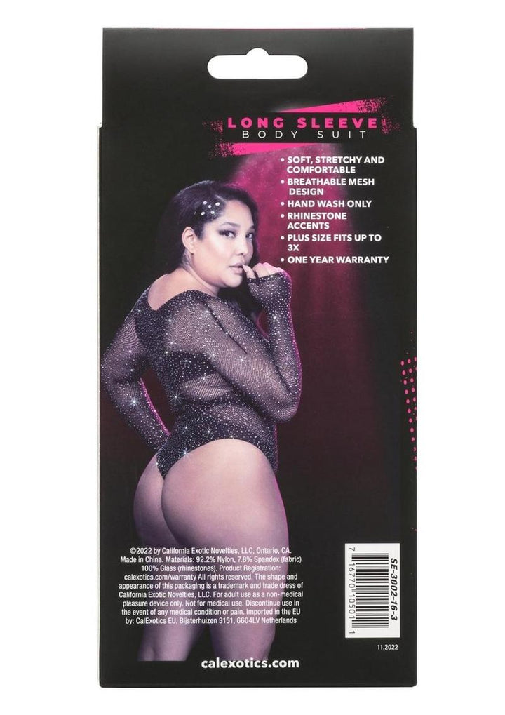 Sexy body suit with the perfect amount of coverage and sexy thong design. Soft, stretchy and comfortable. Breathable mesh design. Rhinestone accents. Plus size fits up to 3X. Hand wash only.