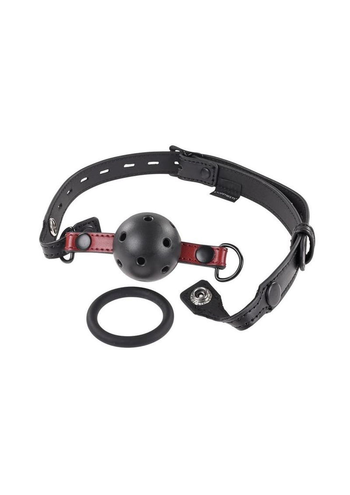 Add the b shhhhb to sultry with rich red accents on a black satin finish. Luxurious faux leather and your choice of bite ring or breathable ball gag make the Saffron Interchangeable Gag a versatile must-have for any bondage collection. Simply unsnap each side of the gag to change out pieces for multiple ways to play.