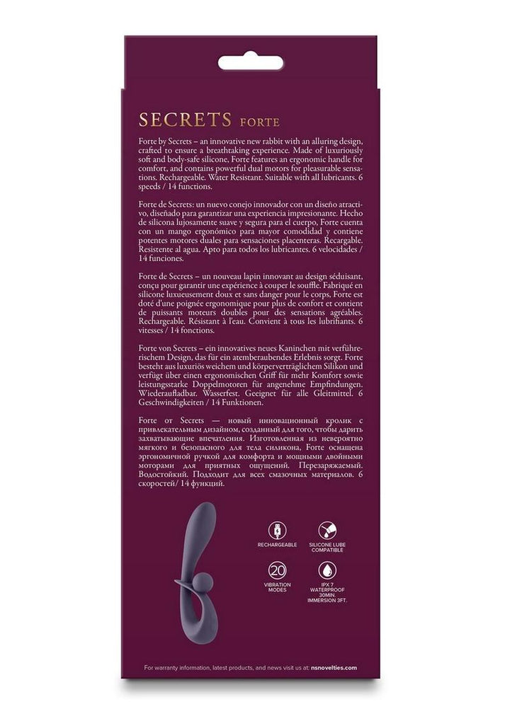 Forte by Secrets b an innovative new rabbit with an alluring design, crafted to ensure a breathtaking experience. Made of luxuriously soft and body-safe silicone, Forte features an ergonomic handle for comfort, and contains powerful dual motors for pleasurable sensations. Rechargeable. Waterproof. Suitable for use with all lubricants. 6 speeds 14 functions 20 modes. Waterproof Rating - IPX7.