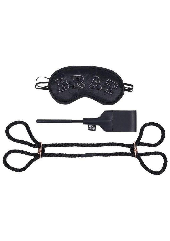 Teach your bratty bottom how to properly submit with the perfectly curated Knotty Brat Kit! Keep them restrained with the included rope handcuffs in a stunning black with rose gold metal accents while you tap and tease every inch of their body with the accompanying mini crop. Punish them by taking away their sight with the included satin blindfold emblazoned with b BRATb , and inflict them with your every naughty desire they deserve.
