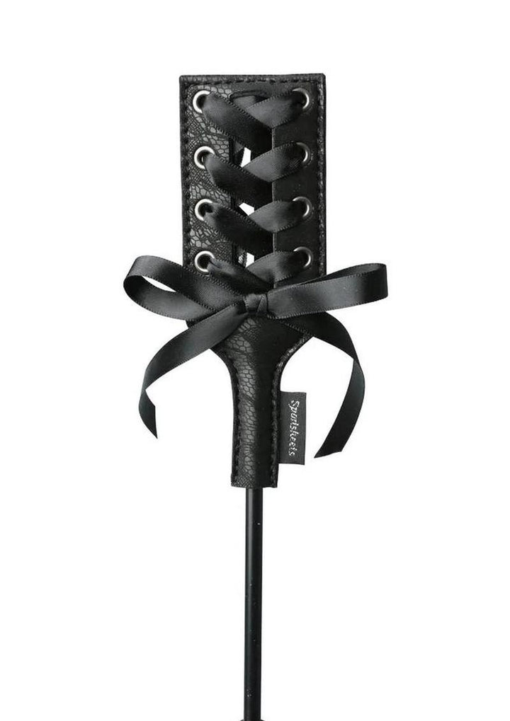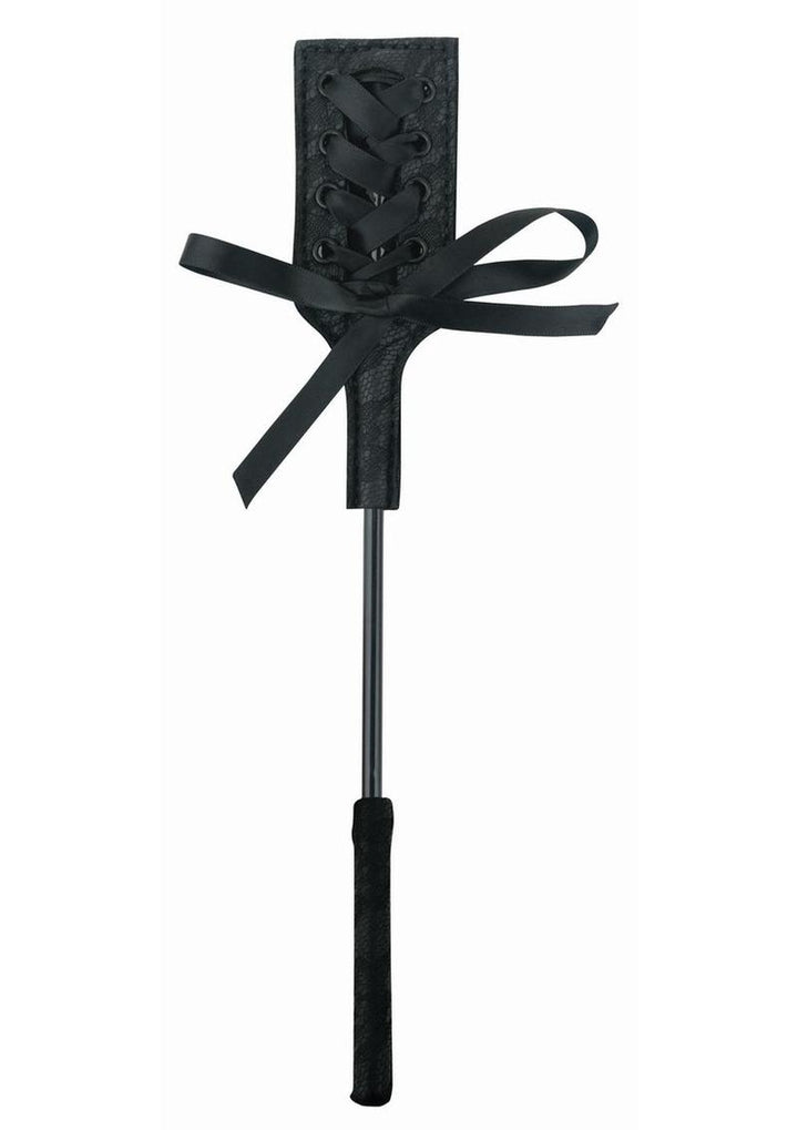 Covered in a luxurious lacy fabric, the head of this stylish, sleek crop is set off with a lavish black corseted ribbon and satin bow. The stem is made of a thin yet sturdy rod. The handle is covered at the base with the same lacy fabric.