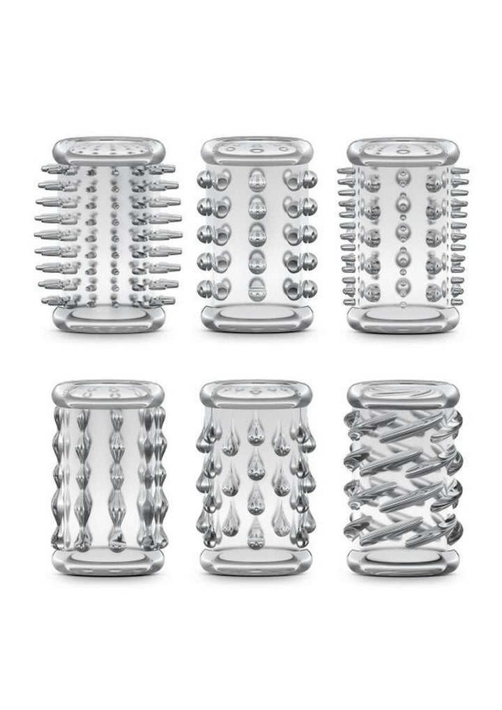 Enjoy this sexual pleasure kit for women, men and couples. Use with your partner or use it solo. It's a simple way to add a new level of pleasure and sensation to your penis, favorite dildo or vibrator. Just slide the sleeve over your shaft. Stack them for even more pleasure. Use more or all of them, mix and match and stack them to create a unique erotic experience every time. Easy to use, and stays in place. Measures 2" Length x 1.4" Width. Comfortably stretches up to 3" Wide. Maximum stretch to 5" Width. Lab tested body safe. Silicone, water based, hybrid lube compatible. 6 piece kit.