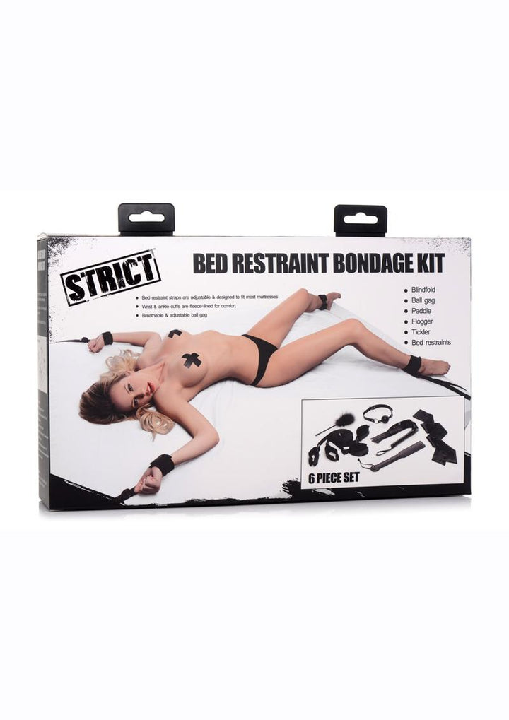- 6-Piece Bondage Kit: Everything you need for kinky bedroom bondage fun is included in this set: A Set of bed restraints, a blindfold, ball gag, paddle, flogger, and tickler.