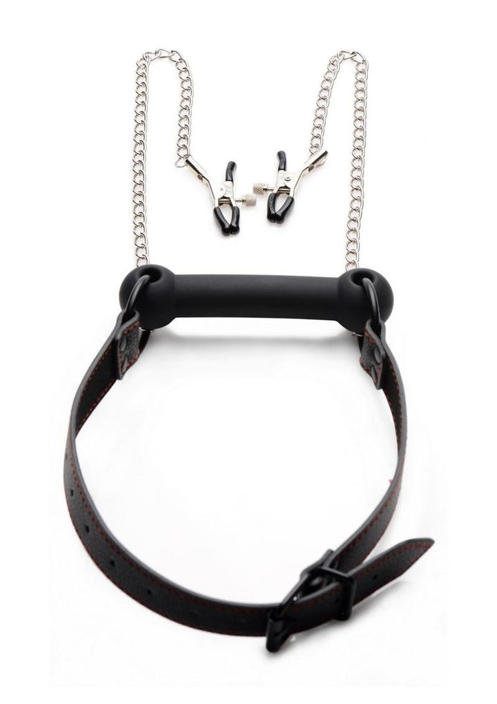 Strict Black Silicone Bit Gag with Nipple Clamps