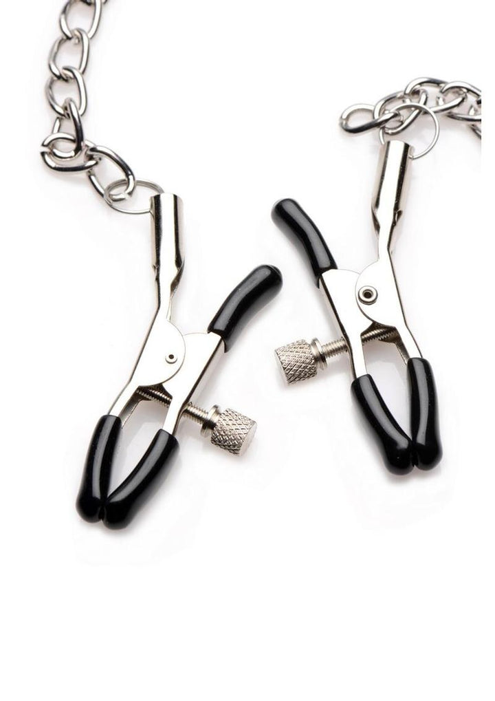 Ideal for training your pony, submissive, or slave, this combination of a bit gag and nipple clamps ensures that your plaything stays quiet, even as you deliver painful pleasure to their delicate nips! Stuff the premium silicone bit into their mouth and secure it with the soft, adjustable, red-stitched straps. The intensity of this devious device is taken up a notch with the addition of two connector chains on the metal rings that hold the gag. Each ends in an alligator nipple clamp, which allows you to adjust the pressure with thumbscrews. Vinyl coated tips make for a comfortable and secure grip. Enjoy every muffled moan and stifled gasp as you tease and torment your pet!