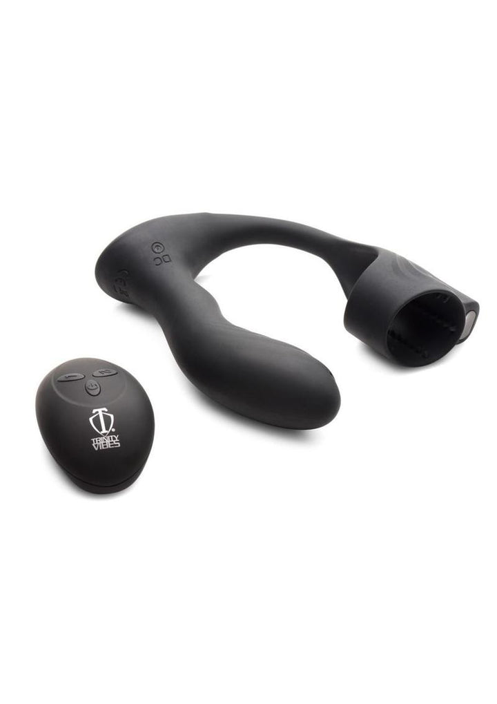 Combine cock and ball pleasure with prostate stimulation with this powerful, vibrating plug! The curved, angled plug is designed to press directly onto your prostate and stimulate it. Connected to the plug is a wide ring that wraps your member in a short sheath with textured nubs on the inside. As you enjoy the squeeze from the constriction ring, one of the two powerful motors is anchored to the sheath so you get powerful vibes directly to your dong! The other motor is sending buzzing sensations to your backdoor via the prostate plug. Choose between 3 speeds and 4 patterns of powerful vibes that you or your partner control with the battery operated remote. Enjoy playing and exploring different dynamics and games with a remote that reaches up to 26 feet! Made of premium silicone, it is soft, stretchy, durable and phthalate-free for body-safe fun.