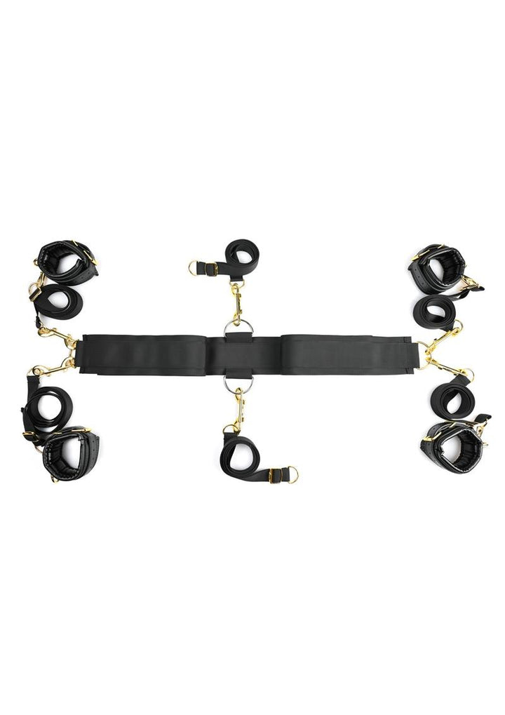 A strong nylon anchor connector strap slides under your mattress to secure six adjustable restraint straps. Four straps end in high-quality faux leather wrist and ankle cuffs with golden hardware while two are crafted with loops that promise leverage of all kinds. Position the straps around your mattress just the way you like them, tie your lover down tight, and slip the soft velvet blindfold over their eyes for a session full of surprises.