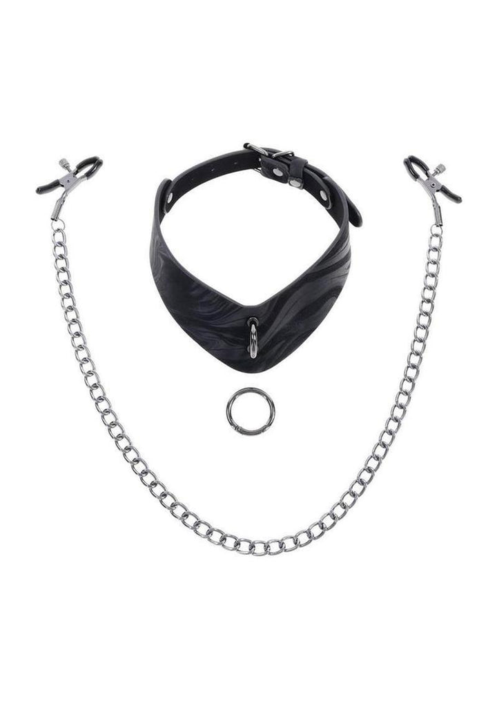 Elevate your scenes with the elegant dominance of the Velvet Noir Collar with Nipple Clamps. Crafted from smooth faux leather with a sleek marbled finish, this posture-style collar commands attention and control. Hematite-plated hardware, including a removable gate ring, offers both sophistication and functionality. A single metal chain connects to adjustable nipple clamps, adding a teasing element that can be removed for even more versatility. Use the collar with the clamps, swap in a leash, or wear it solo as a stylish day collar. Designed for both comfort and exploration, this piece invites you to play with power on your terms. Features: Unique, posture-style collar which fits necks up to X offers a bold, refined look Hematite-plated hardware with a removable gate ring offers versatile use with nipple clamps, a leash (sold separately), or as a day collar Single metal chain with adjustable nipple clamps adds a sensual, teasing element